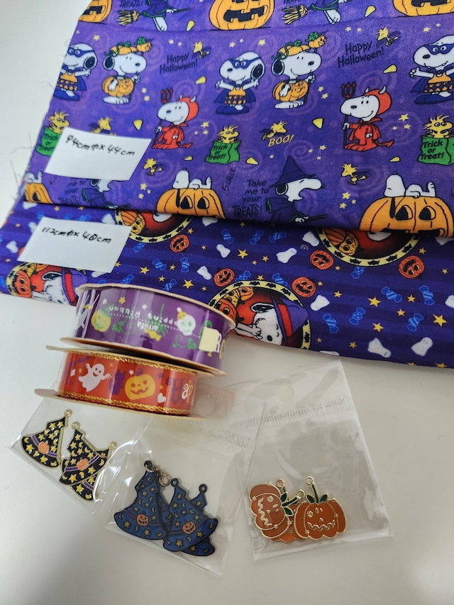 【リユース資材販売です】 (生地) スヌーピーのハロウィンデザイン生地2種 どちらも一部裁断跡ありますが 半端部分を省いての長さ表記です ・94cm幅×44cm ※幅なり残ってません ・112cm×40cm (リボン)新品2種 ・紫 18ミリ幅×1.5m ・赤 15ミリ幅×2m (チャーム) ・かぼちゃ 3つ ・紫帽子 3つ ・青帽子 4つ ※1つカニカンついたままです クリックポストで コンパクトにしての発送です ご了承ください